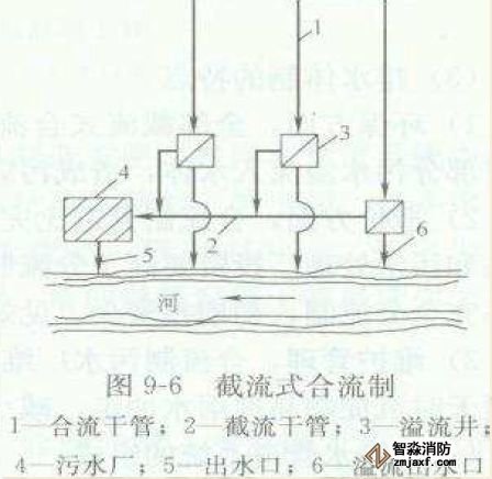 臨河岸邊建造一條截流干渠,同時在合流干管與截流干管相交前或相交處設置溢流井,并在截留干管下游設置污水廠。晴天和初降雨時所有污水都排送至污水廠,經(jīng)處理后排入水體,隨著降雨量的增加,雨水徑流也增加,就有部分混合污水經(jīng)溢流井溢出,直接排入水體。